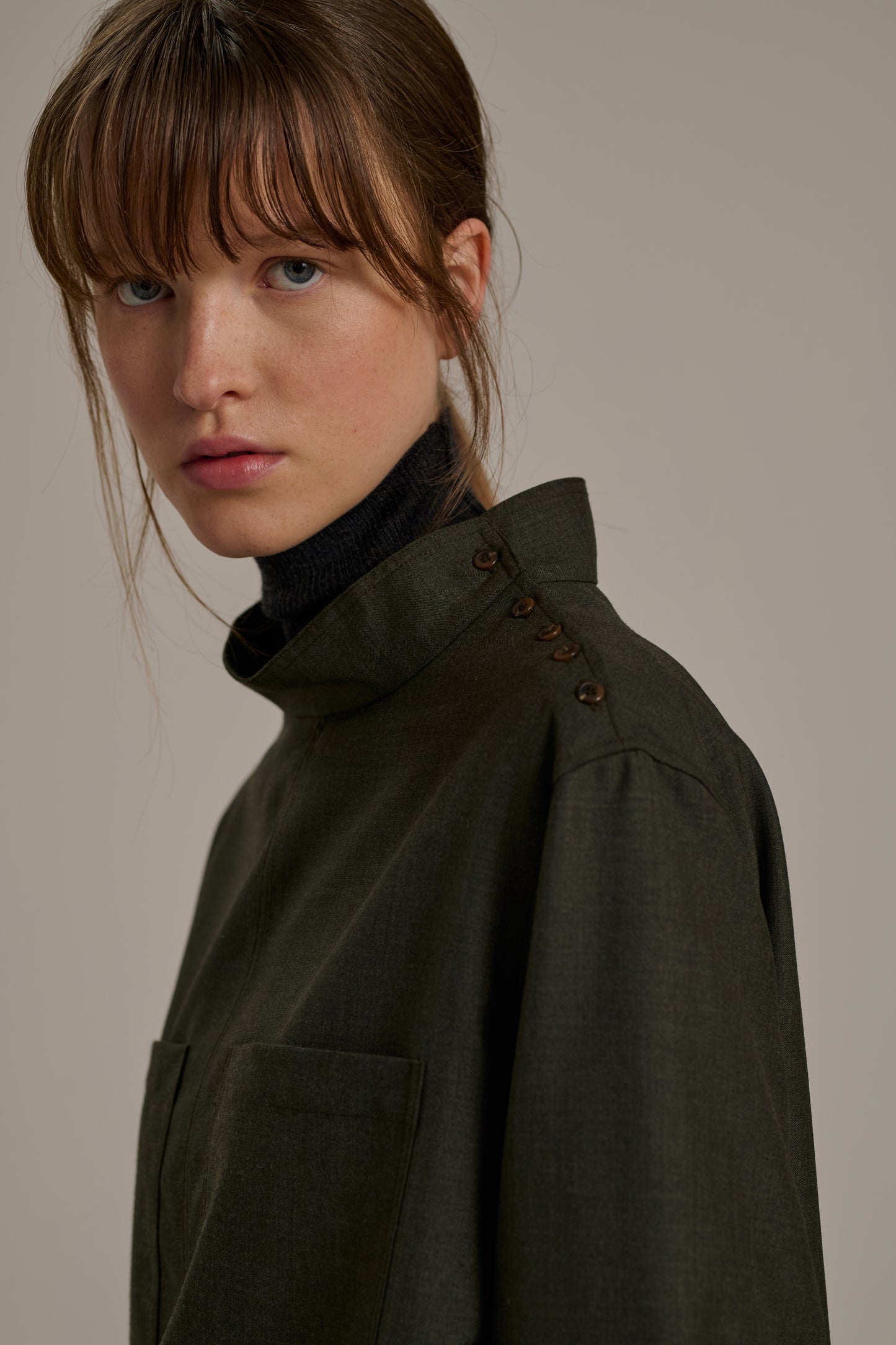 CANNES est une blouse en toile de coton laine. Avec sa coupe droite et ses manches très longues, et son col cheminé dégagé du cou, elle offre un style élégant et confortable.