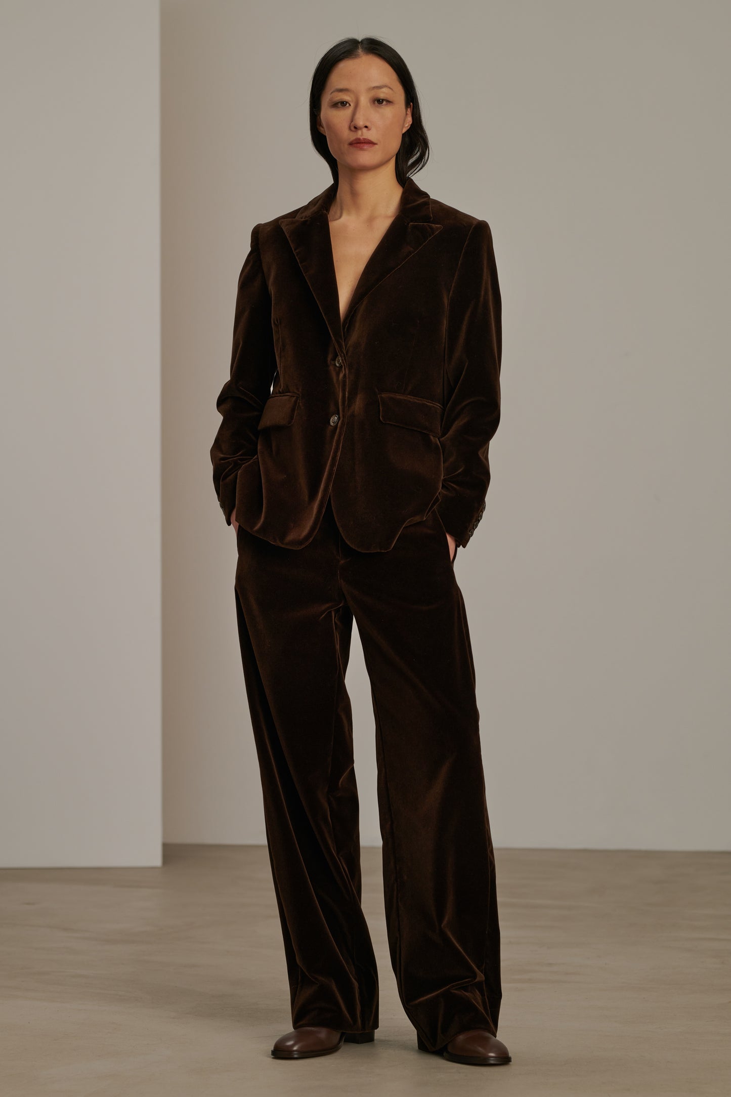 CELESTIN est un pantalon taille haute légèrement évasé. Sa coupe minimaliste, sans ceinture ni pinces, s'adapte à toutes les morphologies. Le velours lisse met en lumière sa teinte marron chocolat brillante.