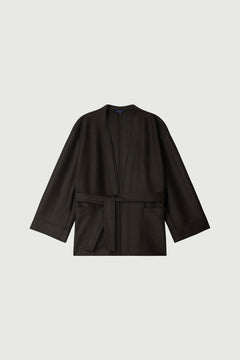 GIBSON est un pantalon en laine bouillie vert ébène, à la coupe ample et arrondie. Ses poches italiennes et passepoilées, ainsi que ses pinces aux genoux, soulignent son style. La laine dense et souple assure une silhouette élégante.