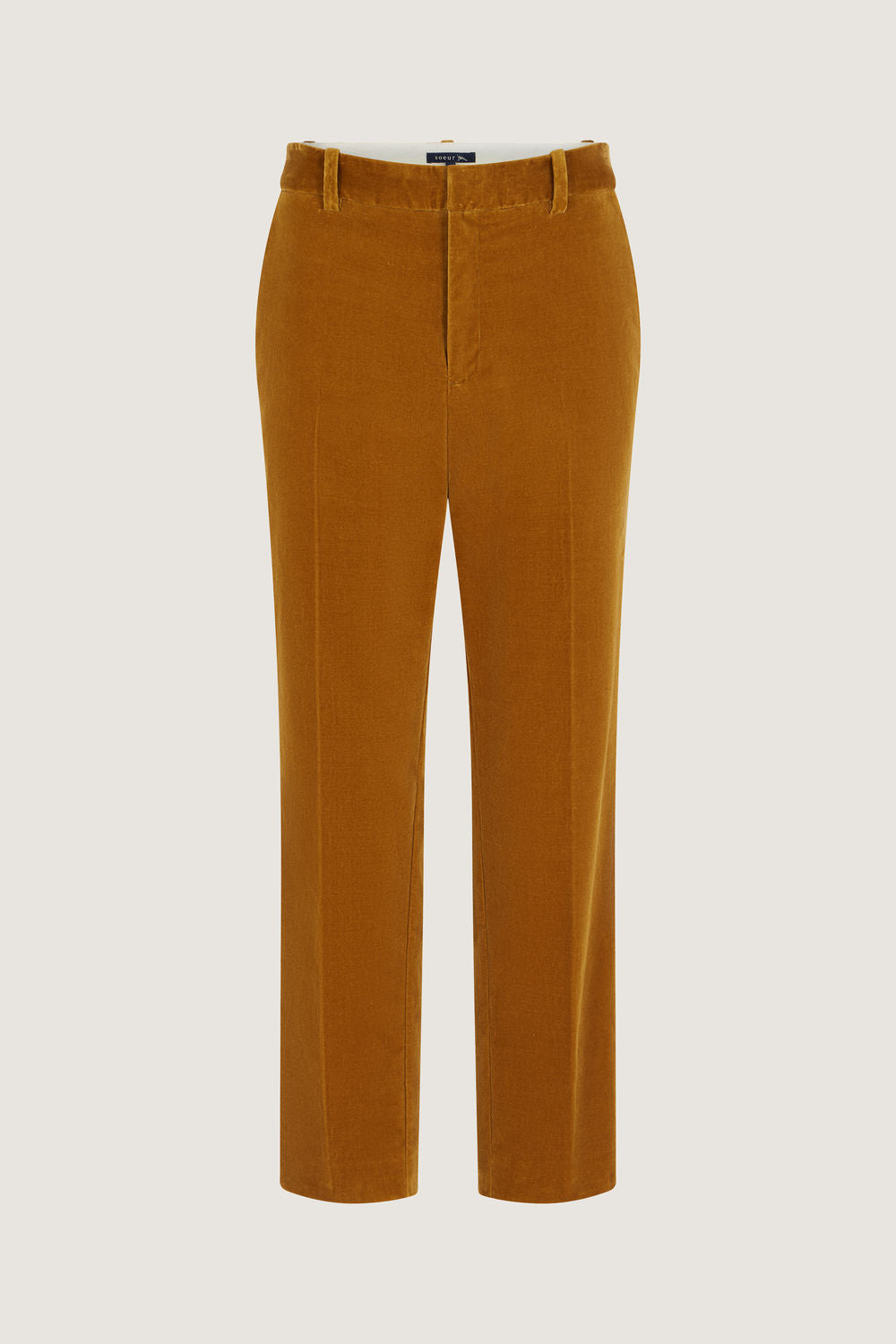 VIANNEY est un pantalon cigarette droit et ajusté. Un pli marqué le long de la jambe allonge la silhouette. Le velours lisse et duveteux apporte de la lumière et des reflets brillants à ce coloris bronze.