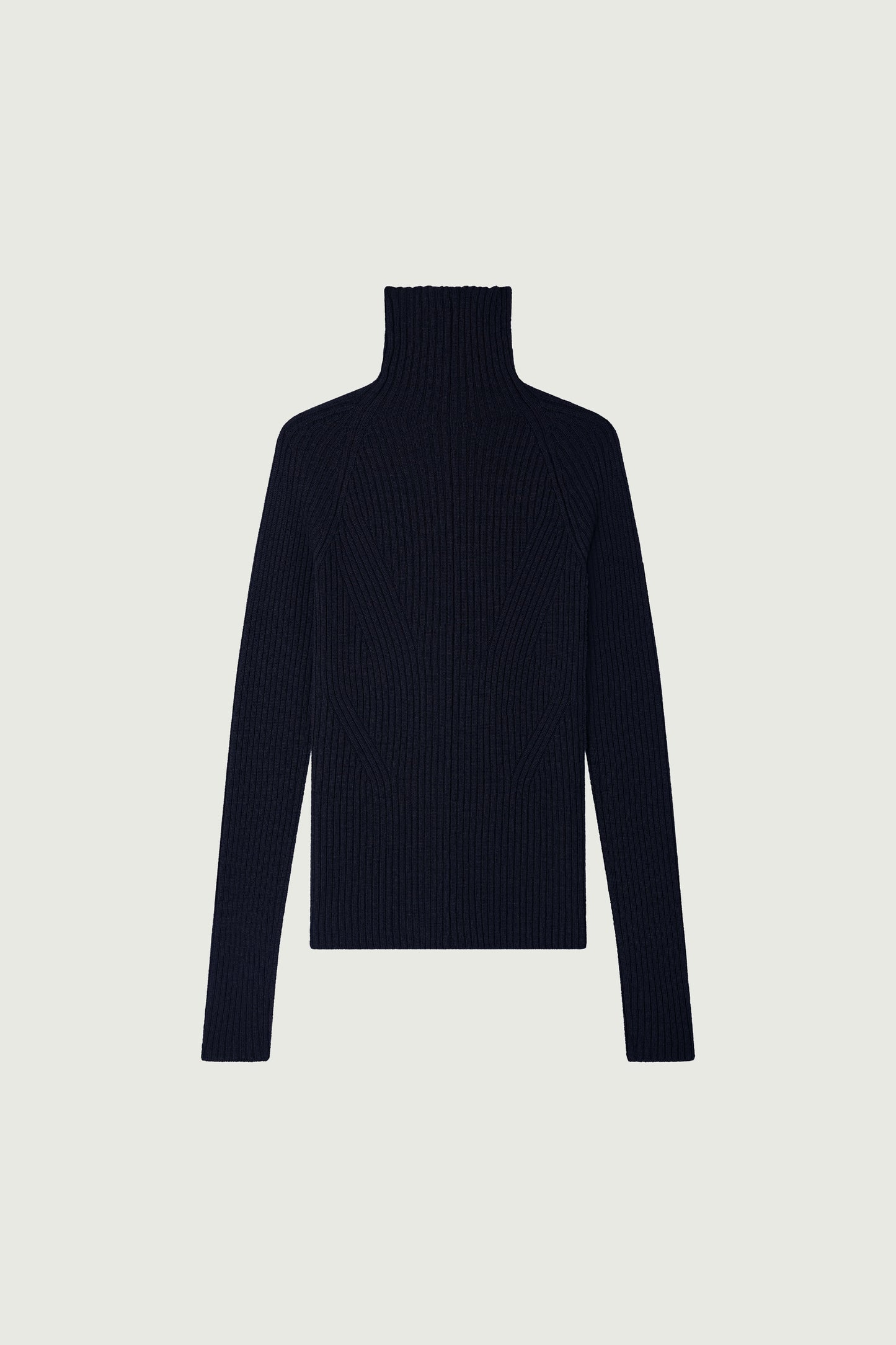 CAMILLE est un pull col montant, tricoté dans un fil de laine mérinos. Un effet de cotes souligne la silhouette, tandis que des manches longues peuvent se porter allongées jusqu'à couvrir la naissance de la main, dépassant légèrement de la manche d'un manteau.