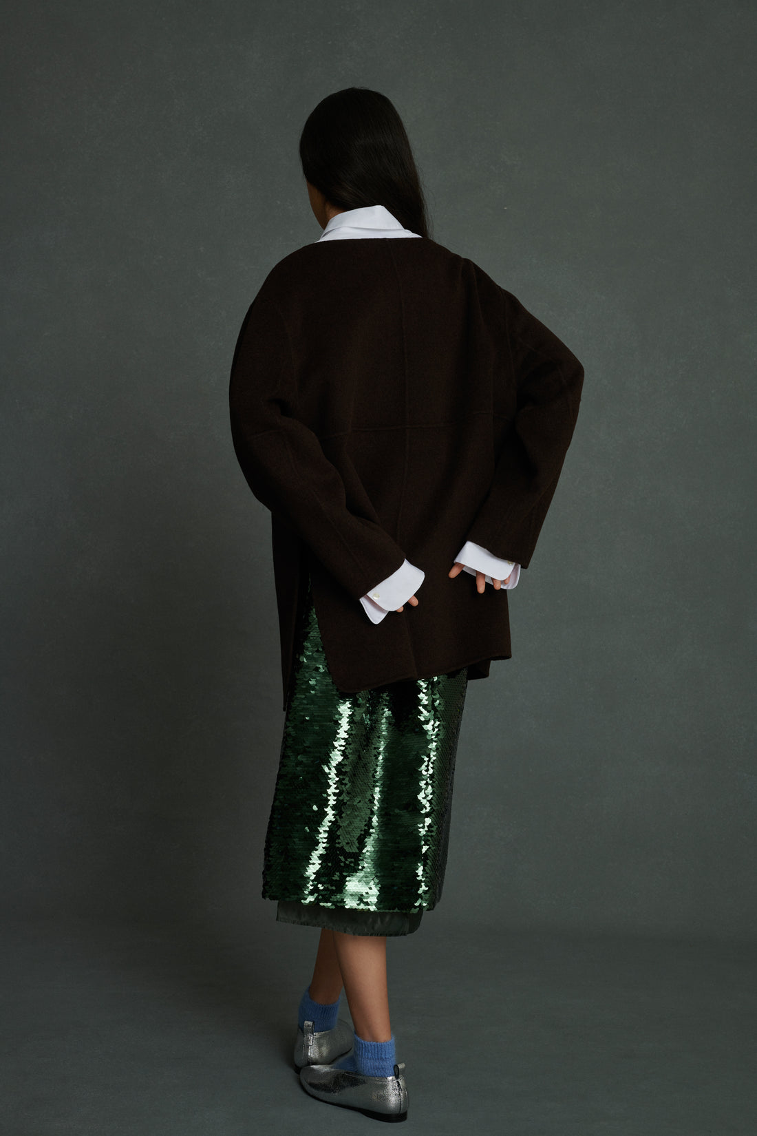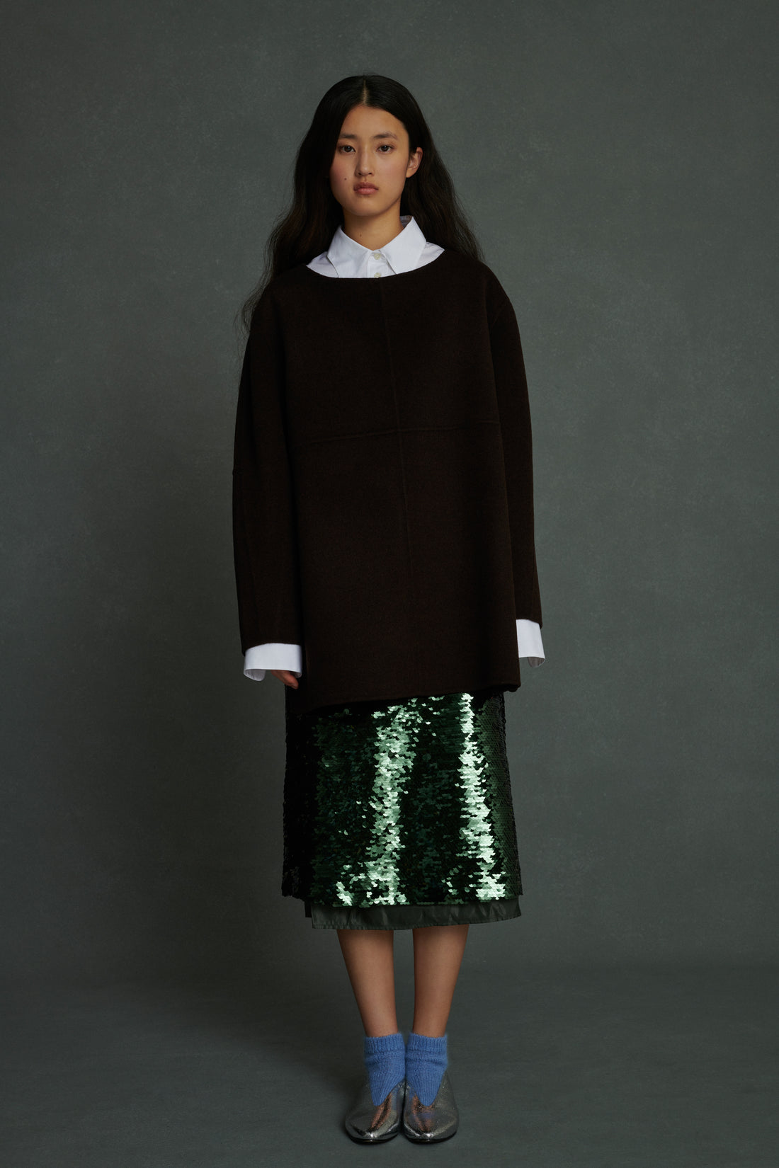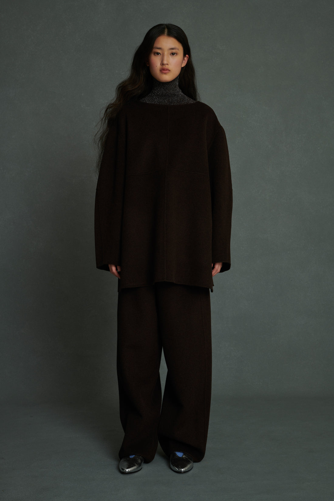 VALERIANE est un pull long et large en laine double-face. Son volume est oversize. Son lainage épais lui apporte de la tenue.