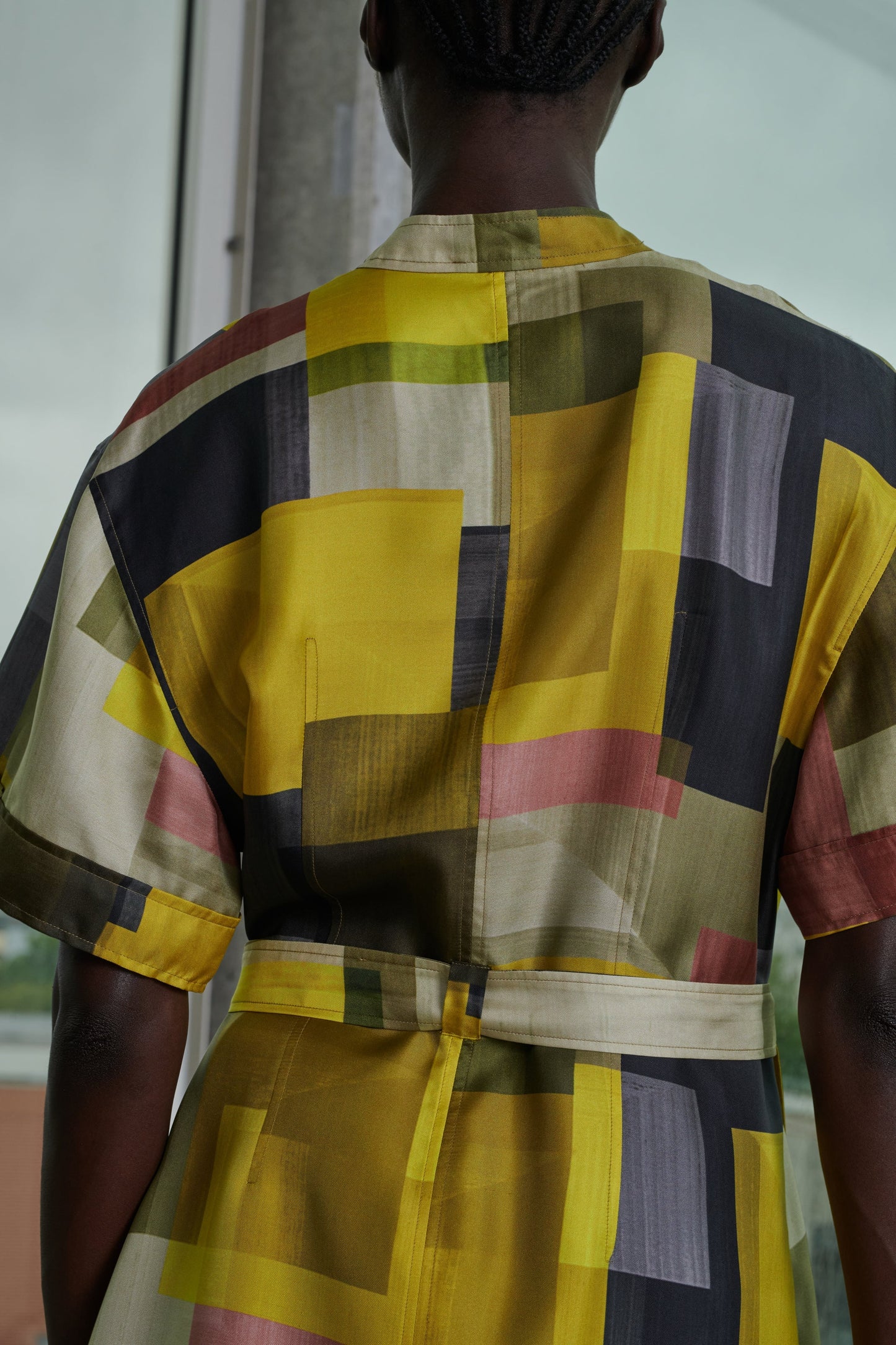 Robe courte en twill de soie imprimé - Coupe courte et volume droit, ceinturée à la taille - Manches courtes et évasées- Patte de boutonnage sur le devant - Col officier- Lien de resserrage à la taille